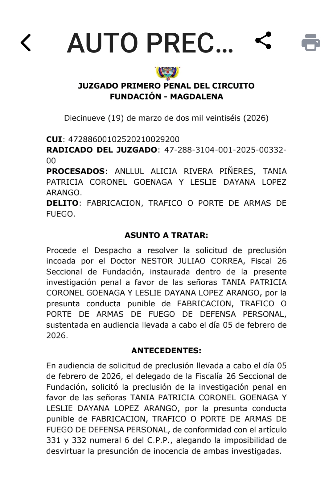 El Juzgado Primero Penal de Fundación acogió la solicitud de la Fiscalía y ordenó la preclusión de la investigación, tras concluir que no existen pruebas que permitan demostrar responsabilidad penal por parte de la procesada.